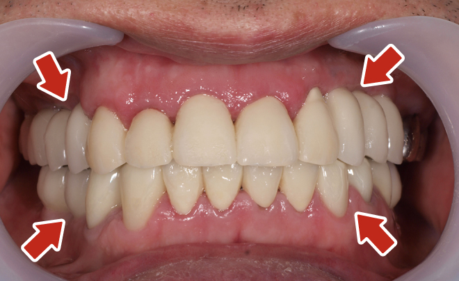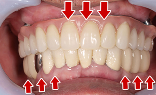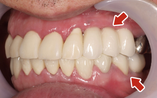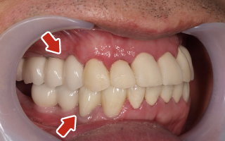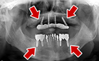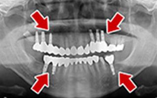 上顎4本で12歯(オールオン4)、下顎4本5歯 上下抜歯即時埋入、即時荷重(手術当日にインプラントの上に仮歯装着) |