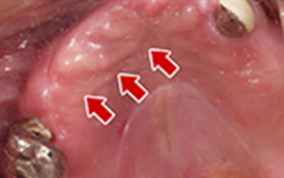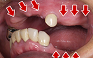 術後の腫れ、痛み(ピークは3日後、1週間で軽減) 上部構造物、仮歯の破折、人工歯根脱落リスクがあります |